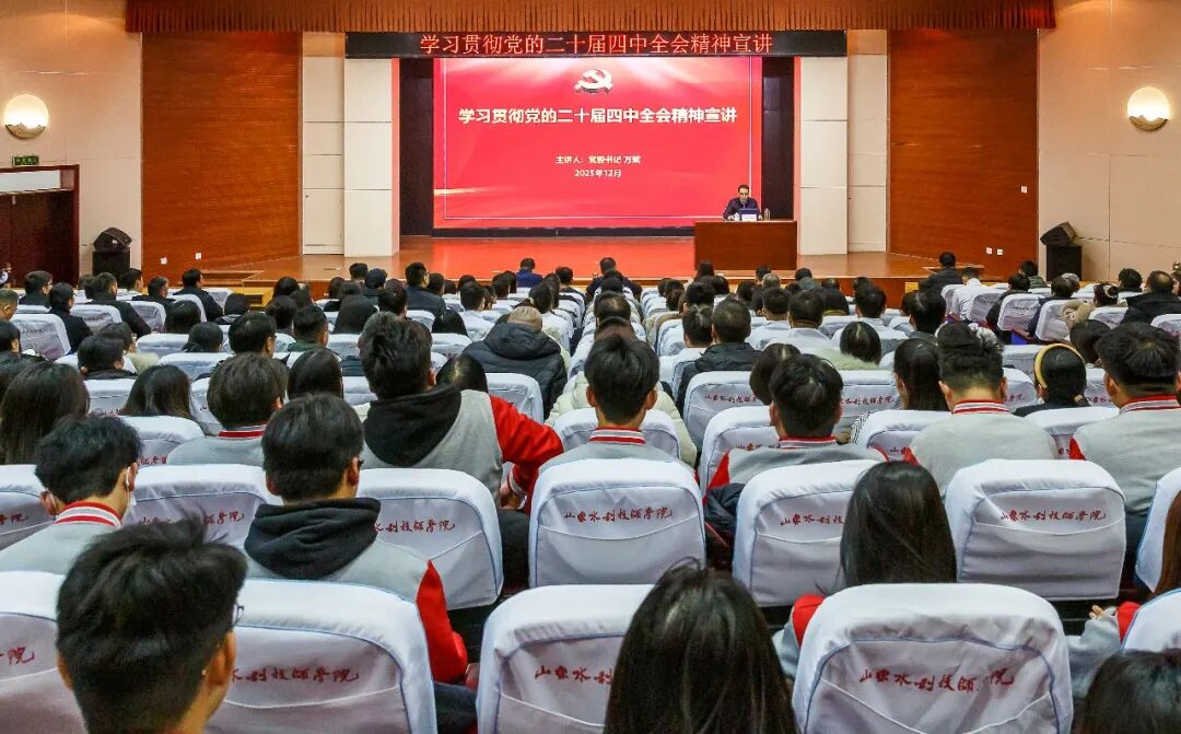 12月30日,山东水利技师学院举行学习贯彻党的二十届四中全会精神宣讲会。党委书记万斌作宣讲报告。全体教职工及学生代表参加。万斌围绕党的二十届四中全会的重大意义、精神实质与实践要求,从提高政治站位、深刻认识党的二十届四中全会的重大历史意义和现实意义,深化思想领悟、准确把握党的二十届四中全会精神的核心要义与丰富内涵,坚持躬身力行、牢牢把握“十五五”时期教育高质量发展的实践要求等三个方面,进行了宣讲,并...