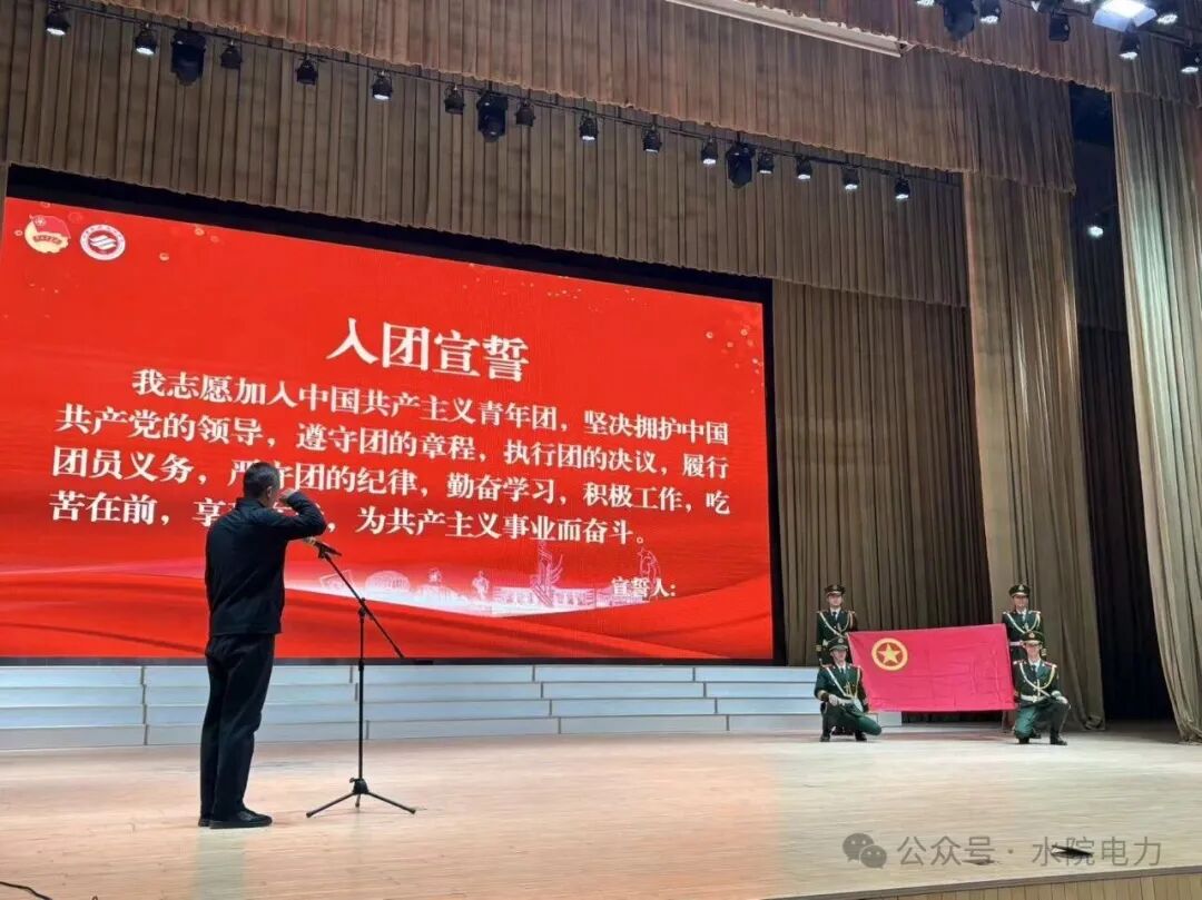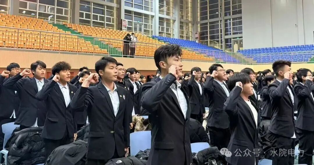 同一时间,电力工程学院2025年秋季新团员共同参与了山东水利技师学院入团仪式。在仪式上,新团员们身着整齐服装,精神饱满,面向团旗庄严宣誓。
