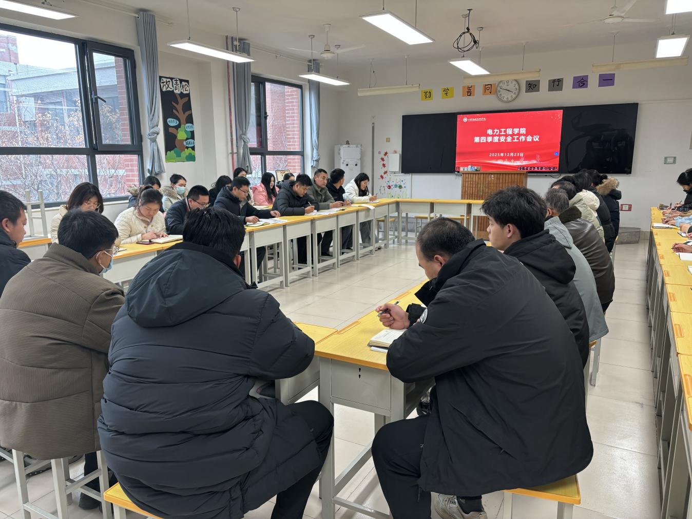 2025年12月23日,电力工程学院召开第四季度安全工作会议。部门负责人刘峰主任主持会议并讲话,本部门负责人及全体教职工参会。