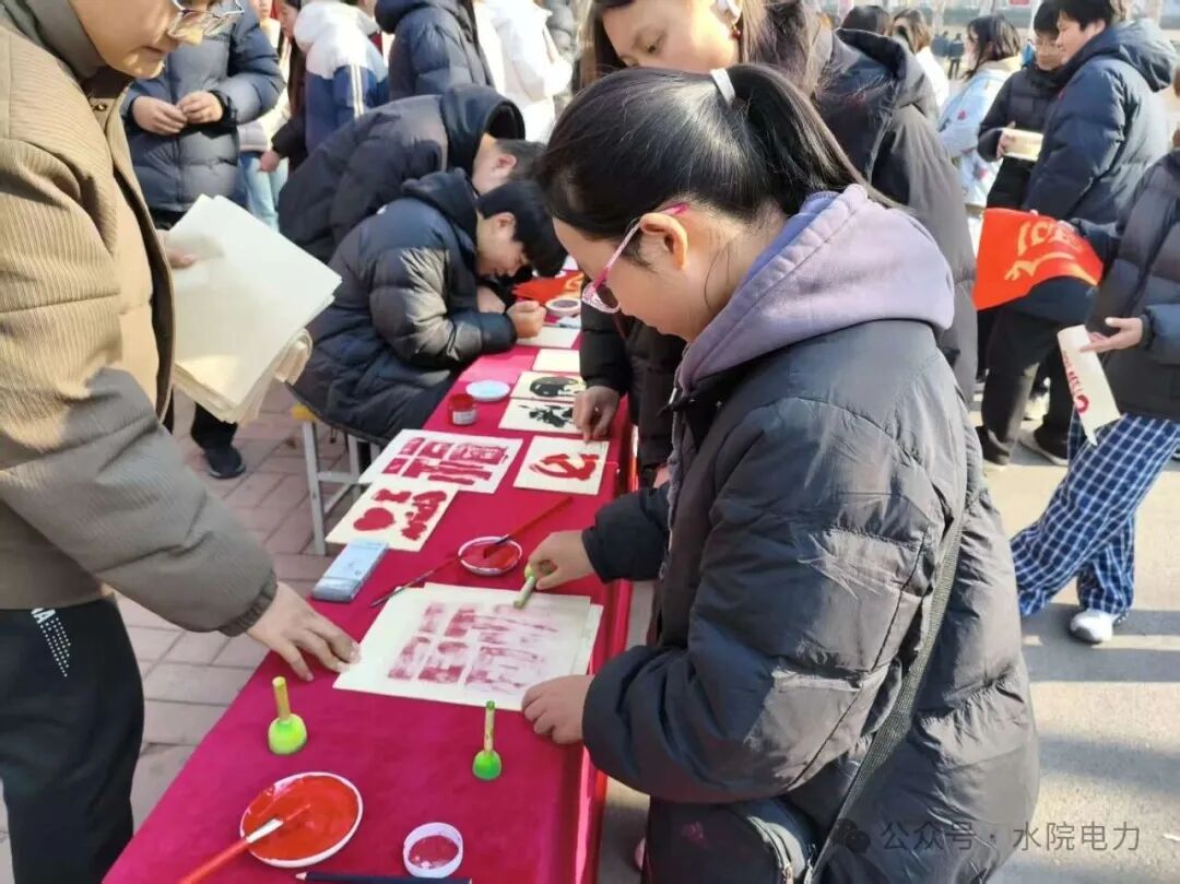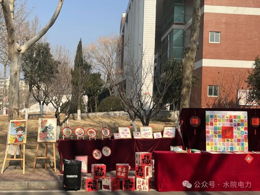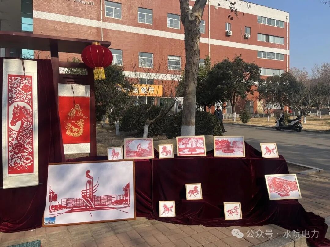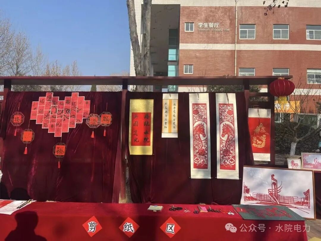 本次活动分为“参观区”与“体验区”两大板块。参观区集中展示了由电力师生共同创作的新年主题海报、非遗剪纸等作品,一幅幅色彩鲜艳、寓意吉祥的海报与精雕细琢的剪纸相映成趣,既承载着对新年的美好祝愿,也展现出师生对传统文化深刻的理解与创造力。