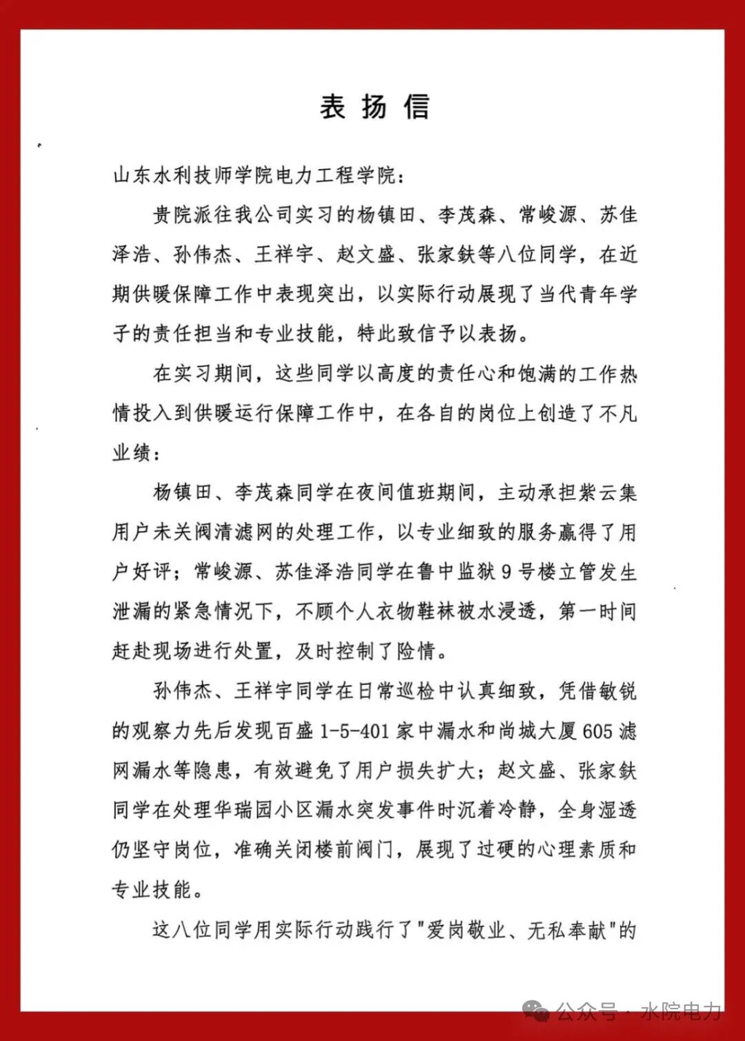 近日,一封热情洋溢的表扬信从山东泰和热力股份有限公司送至电力工程学院,对杨镇田、李茂森、常峻源、苏佳泽浩、孙伟杰、王祥宇、赵文盛、张家鈇共8名实习学生给予高度赞扬,称他们在近期的供暖保障实习中表现突出,以实际行动展现了当代青年学子的责任担当和卓越的专业技能。