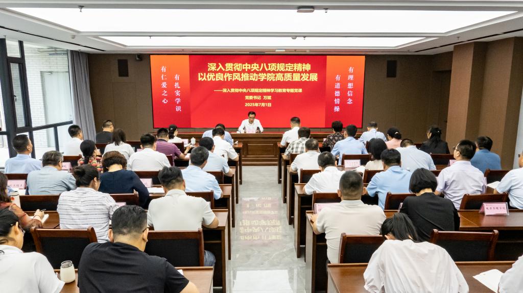 万斌要求,要提高政治站位,加强思想教育,从党的百年奋斗历程中汲取精神力量,增强党性修养,坚定理想信念,自觉践行优良作风。要加强制度建设,强化制度执行和监督检查,自觉维护制度的严肃性和权威性。要改进工作作风,深入调查研究,优化工作流程,加强沟通协作,提升整体工作效能。要密切联系师生,畅通沟通渠道,切实解决学院发展和师生关心的实际问题。要以史为鉴,传承好“延安作风”,以“永远在路上”的执着,把中央八项规定精神转化为立德树人的实践动能,以“硬作风”锻造“硬实力”,加快推动学院高质量发展。