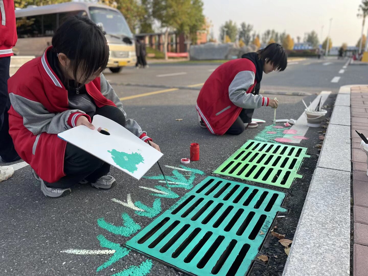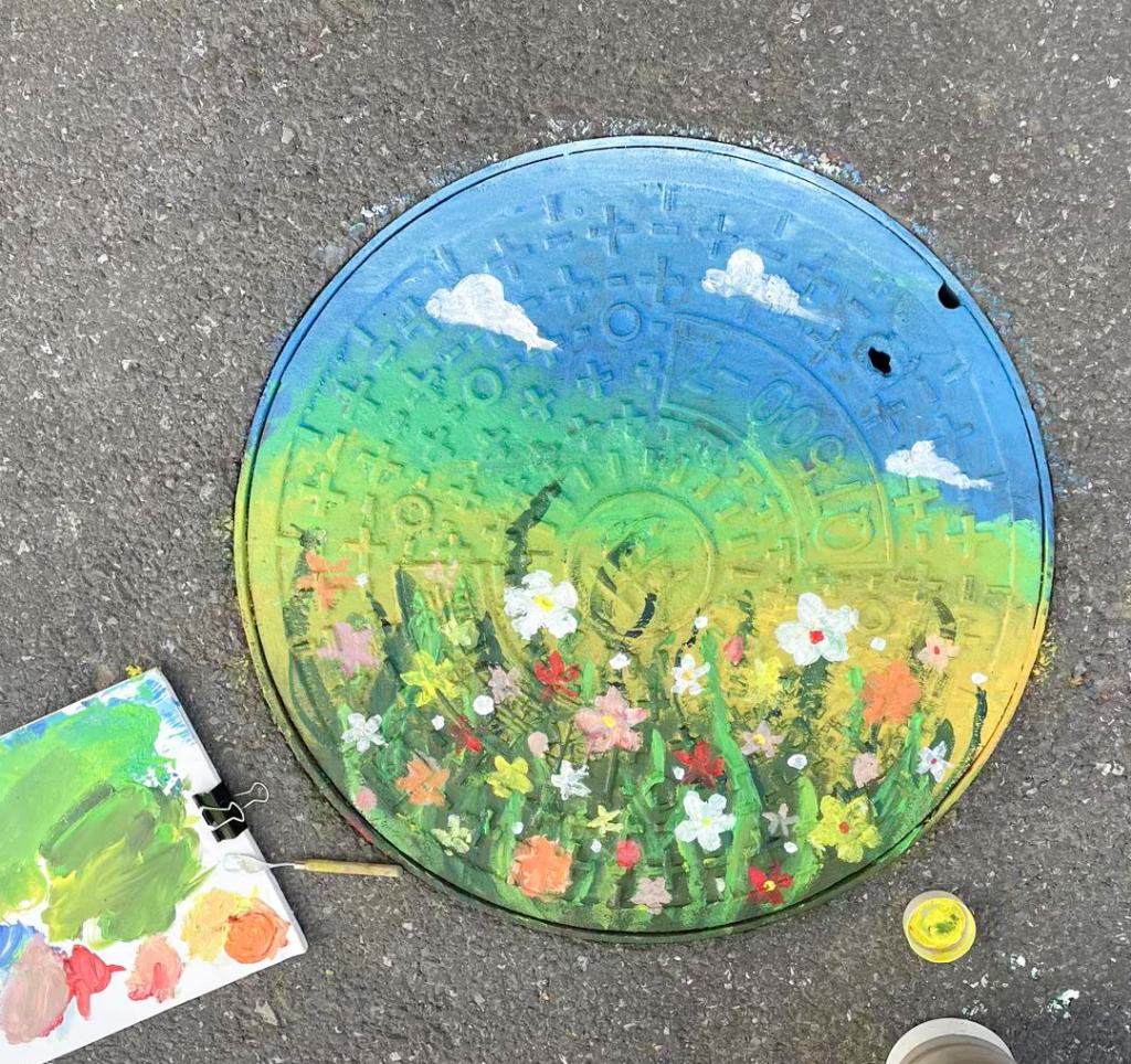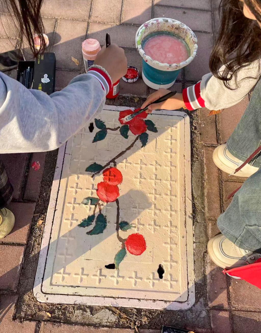 活动将课堂所学与校园美化相结合,组织同学们用手中的画笔和斑斓的色彩,为校园的普通井盖换上“新装”。活动现场,同学们热情高涨,精心设计图样,细心勾勒线条,专心填充颜色。原本冰冷单调的井盖,在他们的巧思妙笔下,逐渐变成一幅幅生动有趣、色彩鲜艳的艺术作品,成为校园中一道流动的风景线。