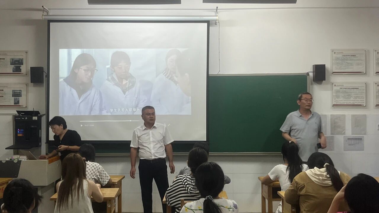 在新生班级教室,交通工程系主任卢建平、交通工程系副主任丛晓琪站在讲台上,对着宣传片里的专业实训场景,向新同学们描绘未来的学习与发展蓝图。