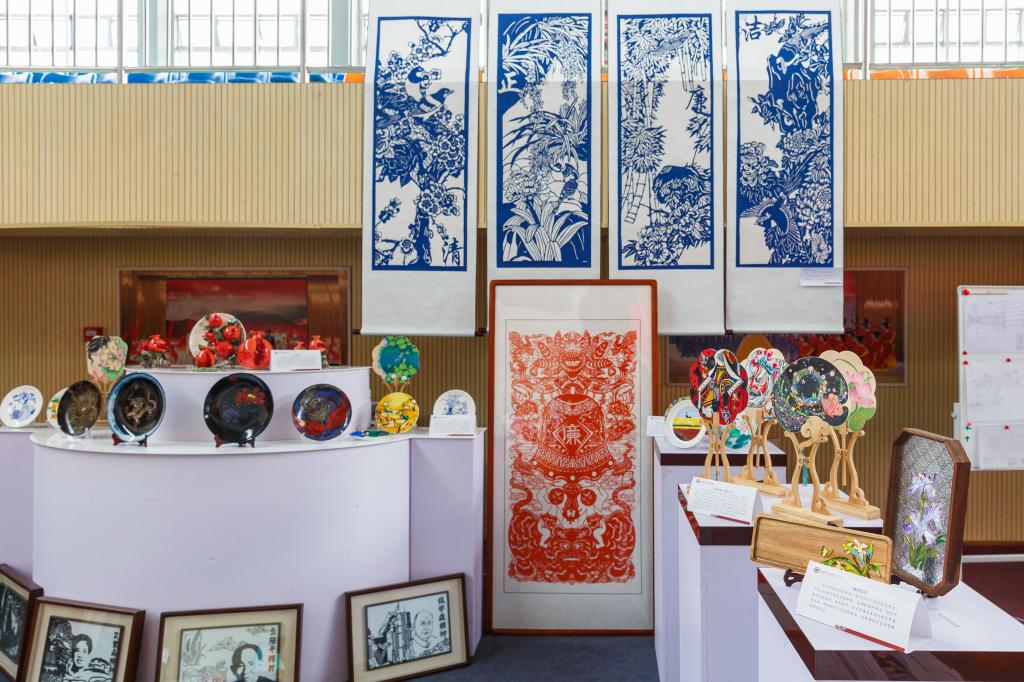 现代管理系创新采用“教育教学+非遗传承”双主线参展。深度参与的工学一体化课程资源开发与教材建设成果、以“民族团结共生”为内核的“石榴映翠”泥塑、学生独立完成的掐丝珐琅作品、“丝缠花韵”缠花古典头饰、画扇画盘等系列非遗作品,涵盖山水景致、民俗风情,体现“双创”教育融入传统文化传承的鲜明特色与育人路径,全面彰显特色育人成果与文化魅力。