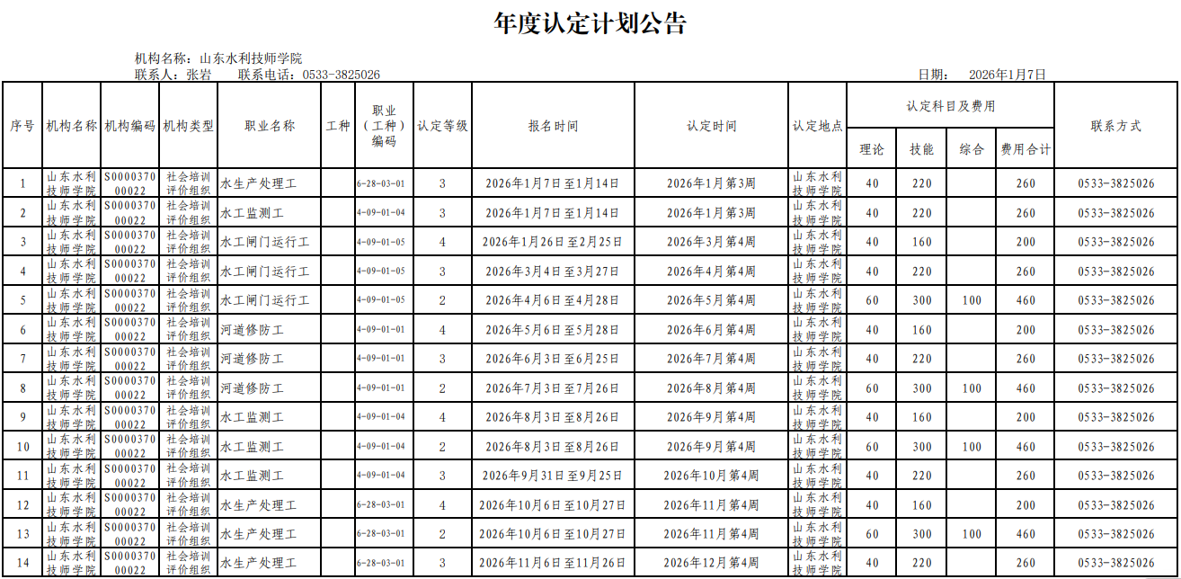 2022年1月,经省人社厅批准(《山东省人力资源和社会保障厅关于公布职业技能等级认定社会培训评价组织名单的通知》鲁人社函〔2022〕4号),我院取得面向社会承担职业技能等级认定资质,目前认定资质范围为4个职业(工种),认定级别包括初级、中级、高级、技师。根据淄博市公共就业服务中心统一安排,结合社会认定需求,现制定2026年度职业技能等级认定计划,具体如下。