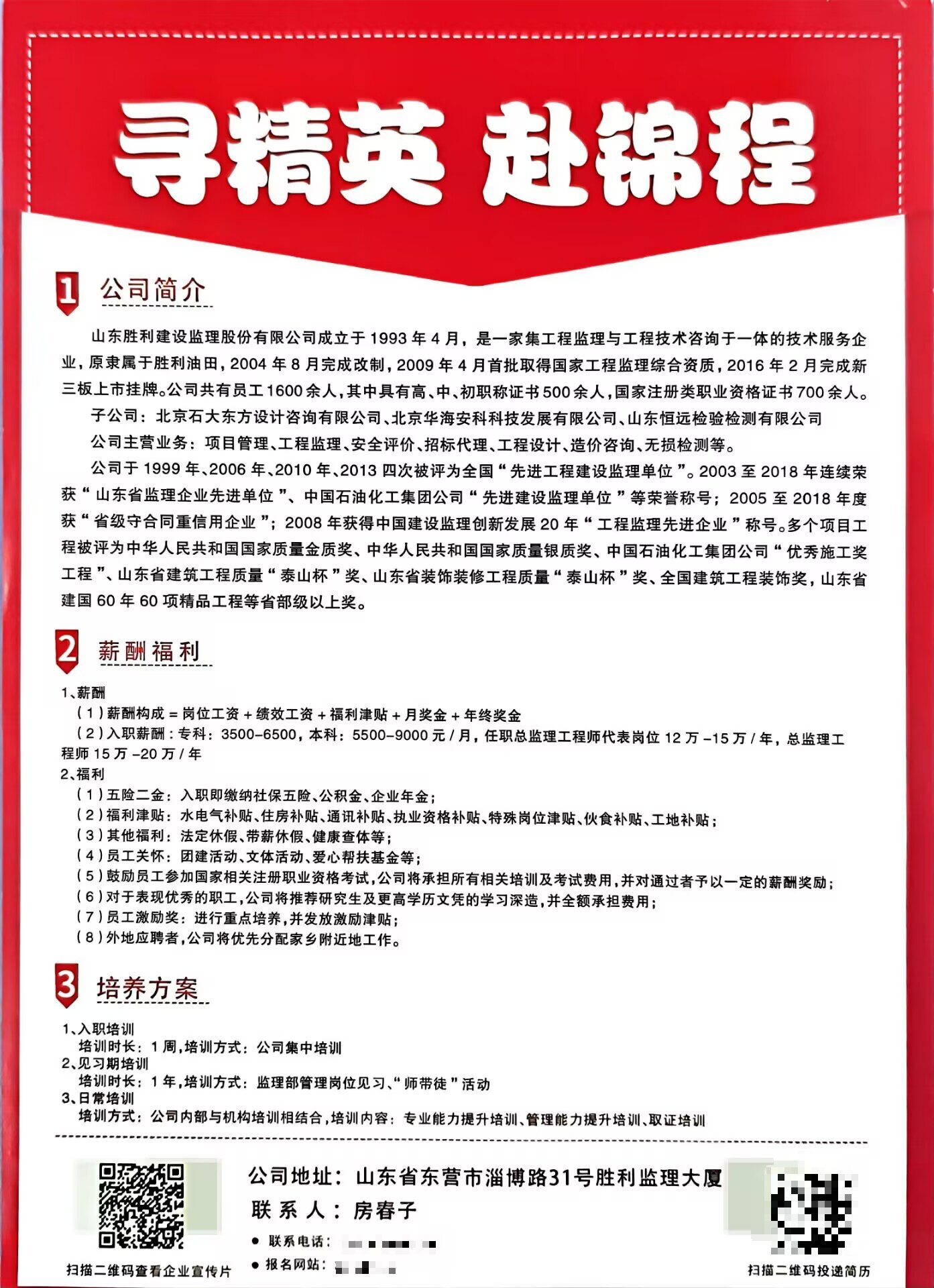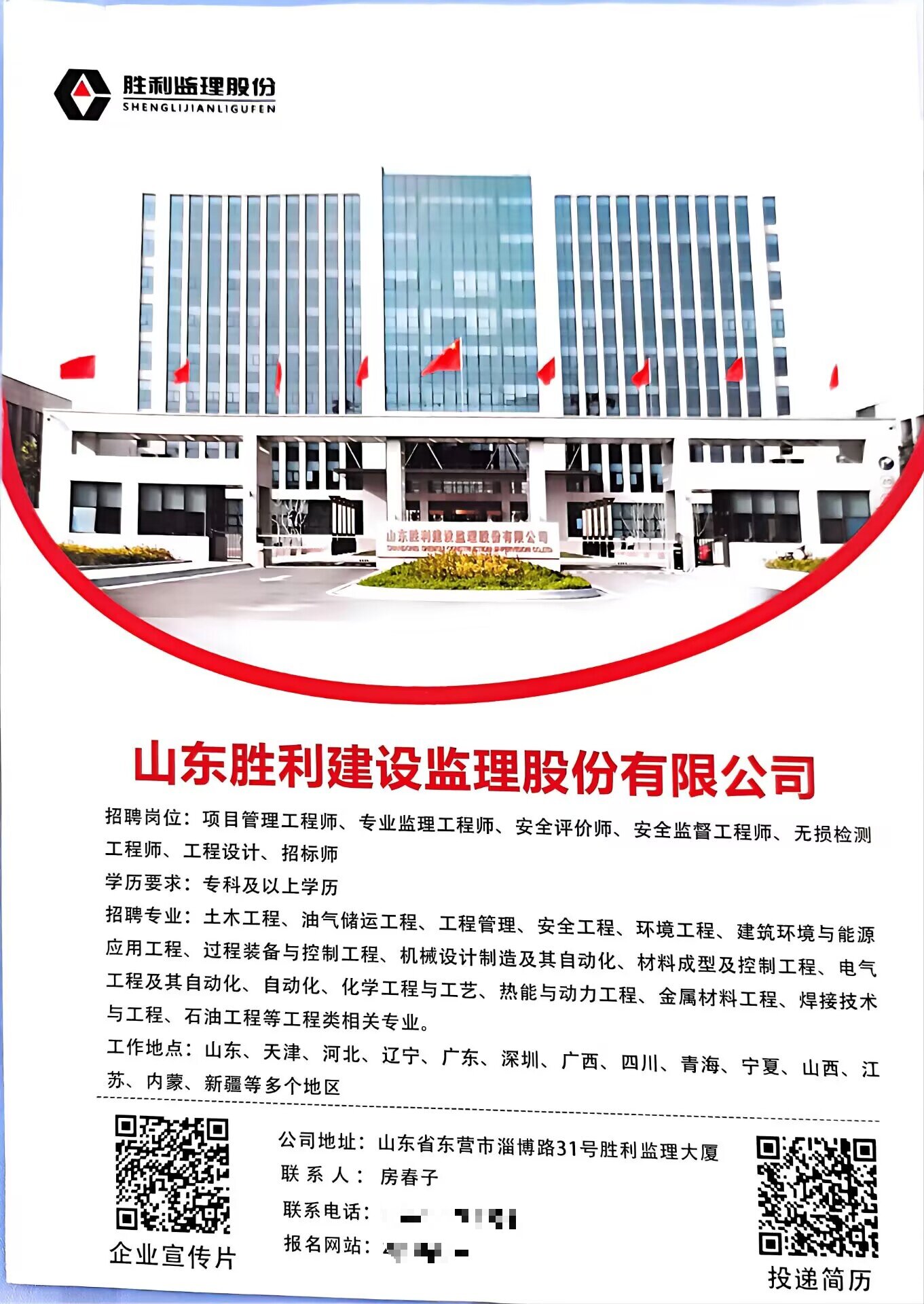 山东胜利建设监理股份有限公司因发展需要,现招聘项目管理工程师5名,专业监理工程师5名,安全监督工程师5名,工程设计师3名,招标师4名。