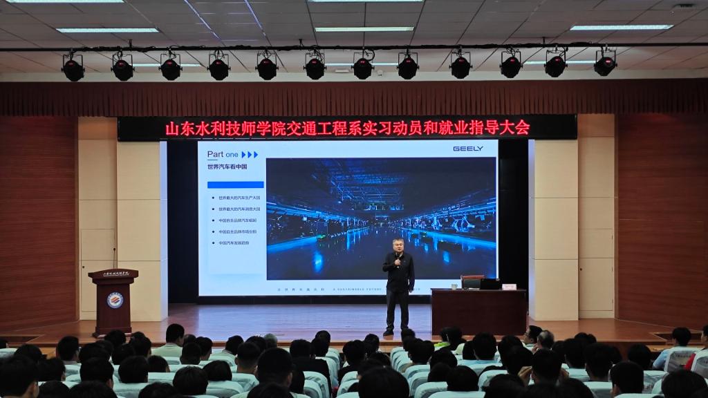 2025年5月23日,交通工程系隆重举行实习动员与就业引导大会。本次大会特邀山东吉利商用车有限公司人力资源部科长赵康出席,为学生们带来专业的行业洞见与职业指导,其中还带来了100个包含汽车销售、汽车营销、汽车维修和汽车组装等优质实习就业岗位。