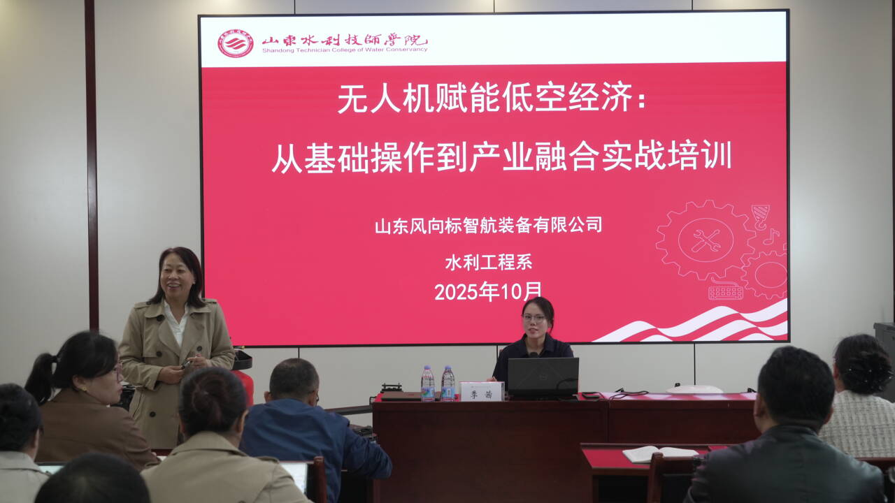 2025年10月11日,水利工程系特邀山东风向标智航装备有限公司走进校园,以“无人机赋能低空经济:从基础操作到产业融合实战培训”为主题开展专题讲座,主讲人为公司市场部负责人季茜经理。水利工程系主任尹鸿雁主持,水利工程系全体教师出席本次活动,与学生代表一同聆听行业前沿分享。