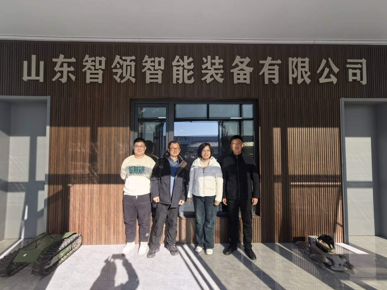 在山东智领智能装备有限公司,公司负责人张开浩给老师们现场展示了搭载智能控制系统的工业级智能装备产品如无人机装备、机器狗、履带机器人等,部分装备远销俄罗斯等国家。由于目前公司业务发展迅速,计划招聘十余名新员工,希望学院多推荐几位优秀毕业生到公司入职。现场展示结束后,在我院毕业生李明昊引导下,老师们参观了设备装调工作室,李明昊同学介绍了目前公司正在研发的新产品,以及智能装备从零部件组装到成品调试的完整流程。校企双方就智能装备领域的融合应用、人才培养、技术研发创新方面进行了深入交流。