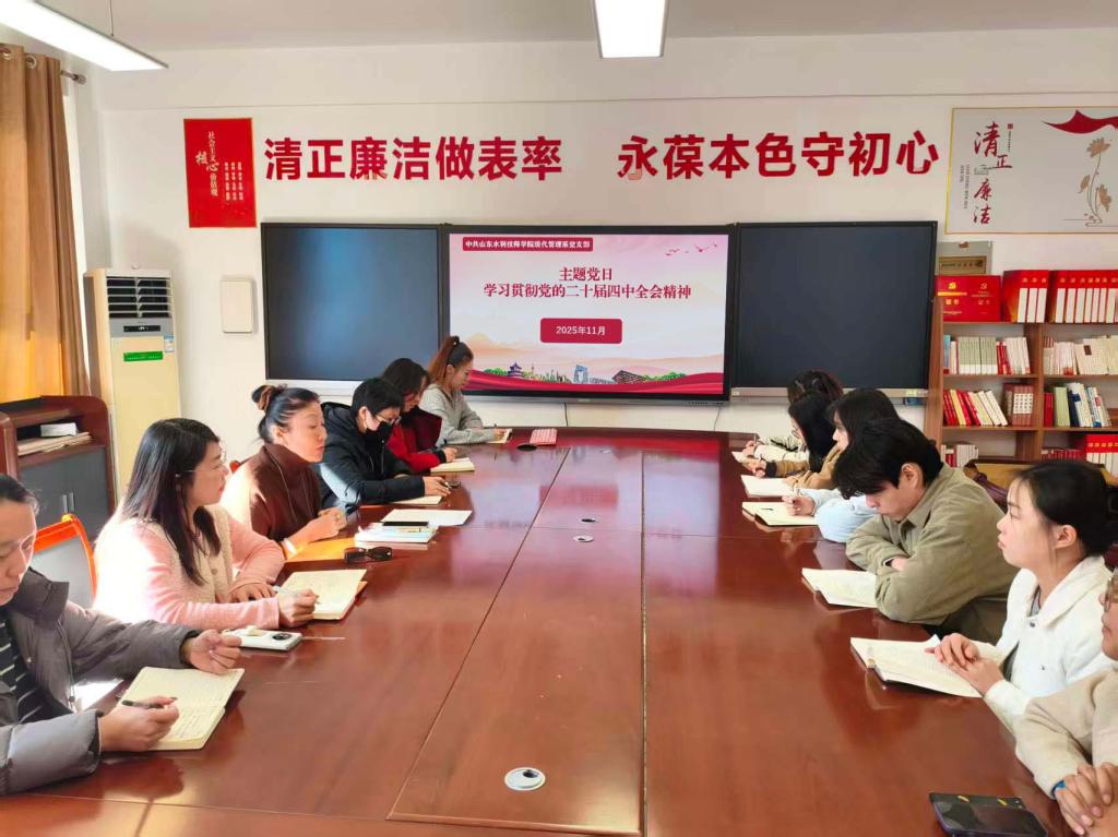 为深刻领会、全面贯彻党的二十届四中全会精神,11月26日,现代管理系党支部组织开展学习贯彻党的二十届四中全会精神主题党日,党支部书记孙茜同志为全体党员传达二十届四中全会精神并结合部门工作职责,部署学习宣传和贯彻落实工作。