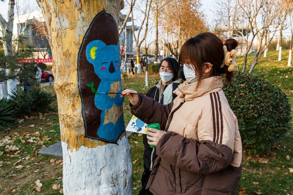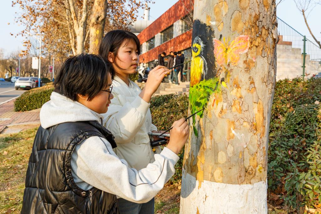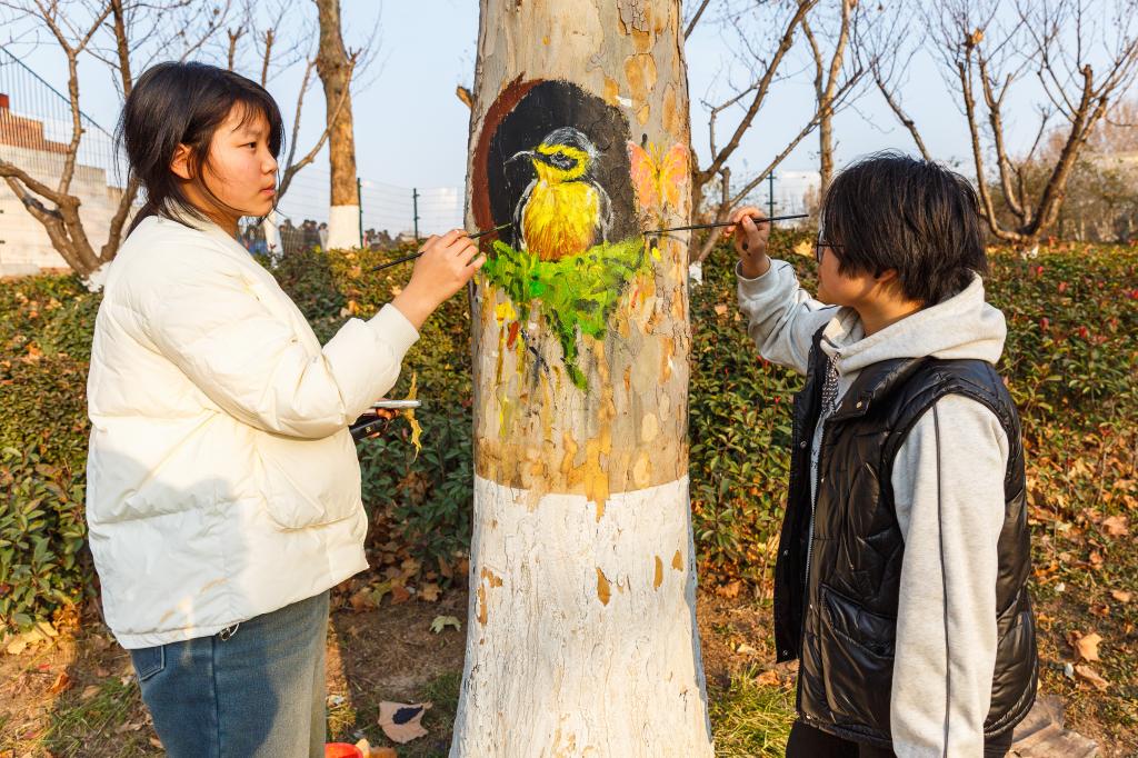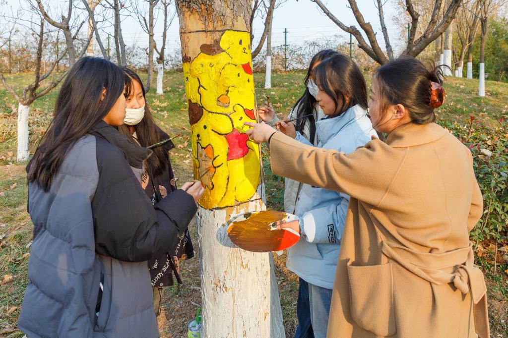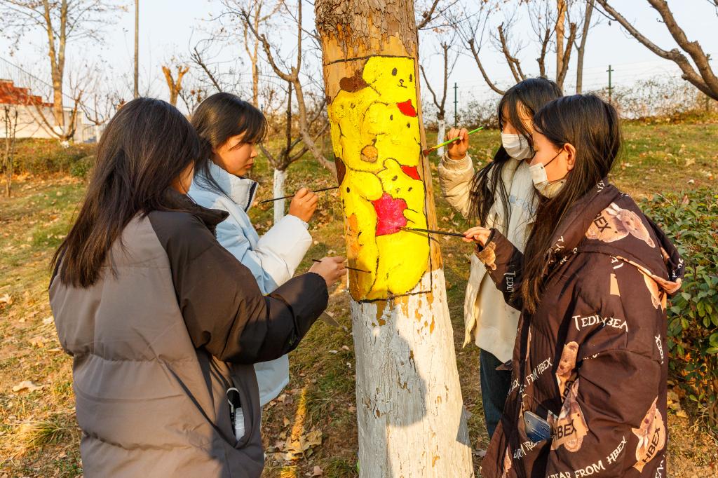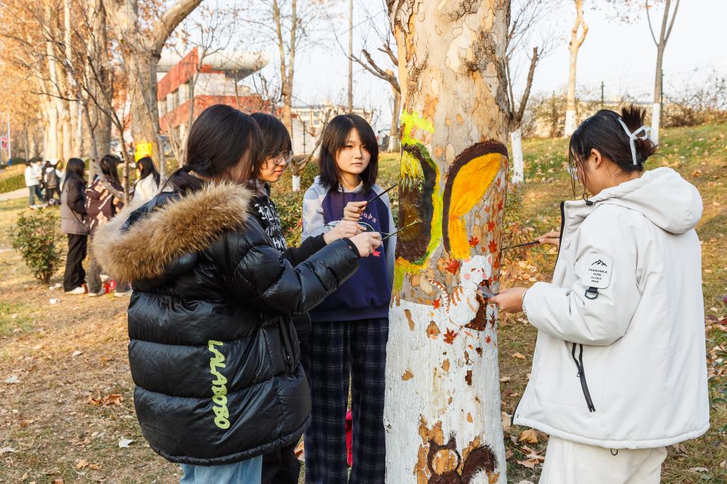 这些治愈系作品,出自现代管理系艺术设计专业的同学们之手。大家在专业课程上带着画笔与颜料走进校园角落,以树木为天然画布,将课堂所学转化为美化校园的实际行动。创作中,有人顺着树皮纹路调整构图,让画作与自然肌理完美融合;有人反复调试颜料,确保色彩在冬日阳光下依旧鲜亮;同学们分工协作,递工具、碰创意的身影,与树间画作相映成趣,成为校园里一道温暖的风景线。