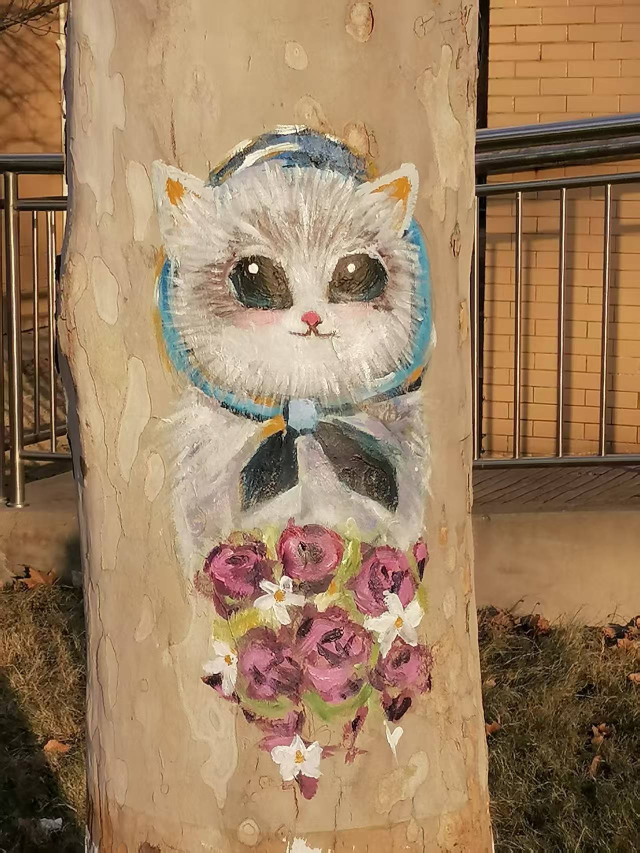 寒风渐起,暖意不减。最近逛校园的你,一定发现了不少惊喜——原本纹理斑驳的树洞,被鲜亮的创意画作填满,Q 版萌宠顺着树皮肌理“探出头”,灵动线条裹着暖色调,让萧瑟冬日的校园多了几分鲜活气息。