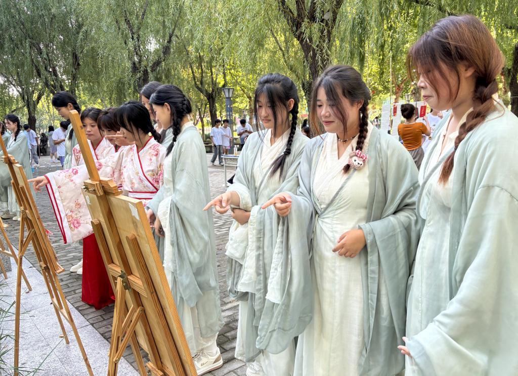 活动现场,部分同学身着汉服,尽显中华服饰的古朴大方;同学们通过亲自制作团扇、书签等文创工艺品,套圈兑换小礼品,营造出一派祥和喜庆的节日氛围。传统服饰+非遗展示、手工制作与传统节日相结合,展现出了中华文化的独特魅力,让同学们感受了一个不一样的传统佳节。
