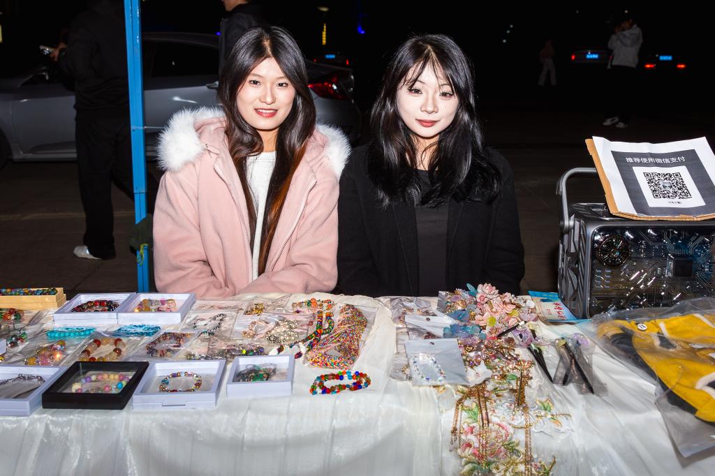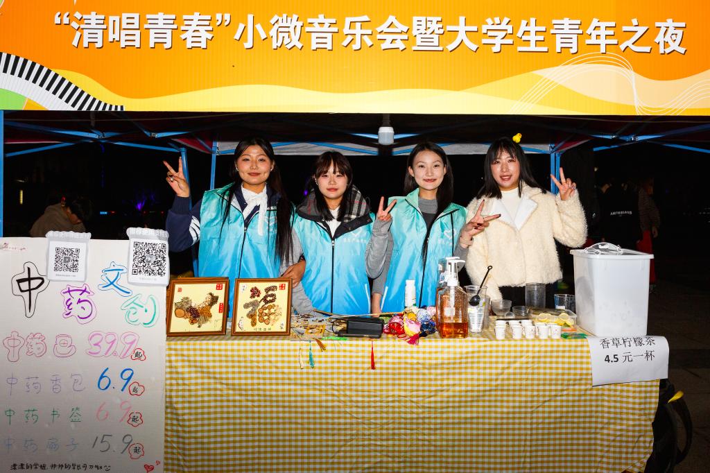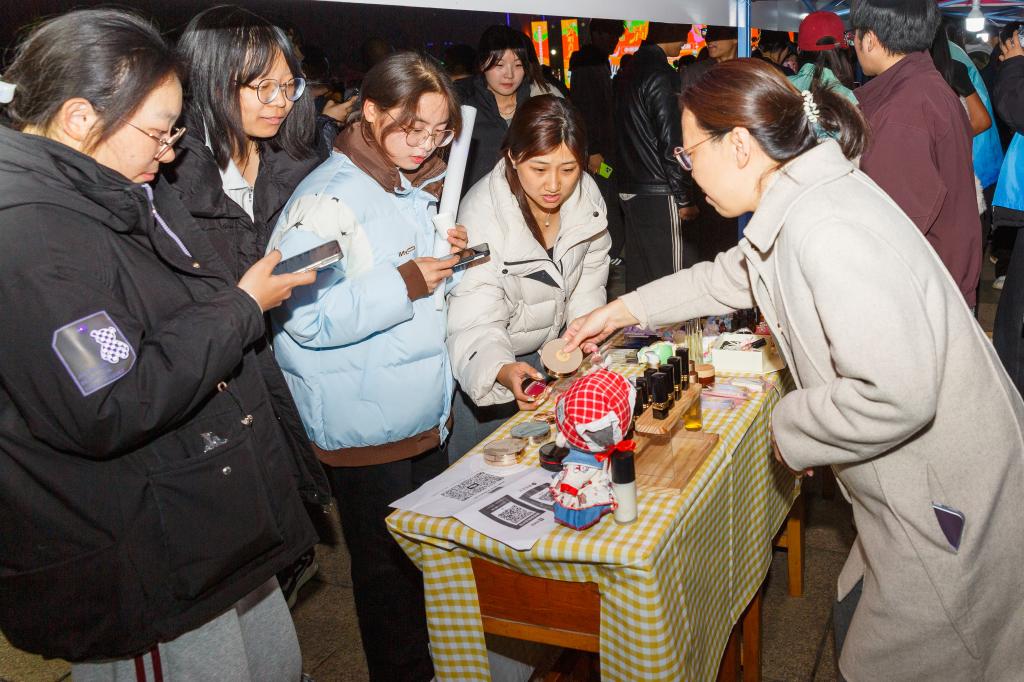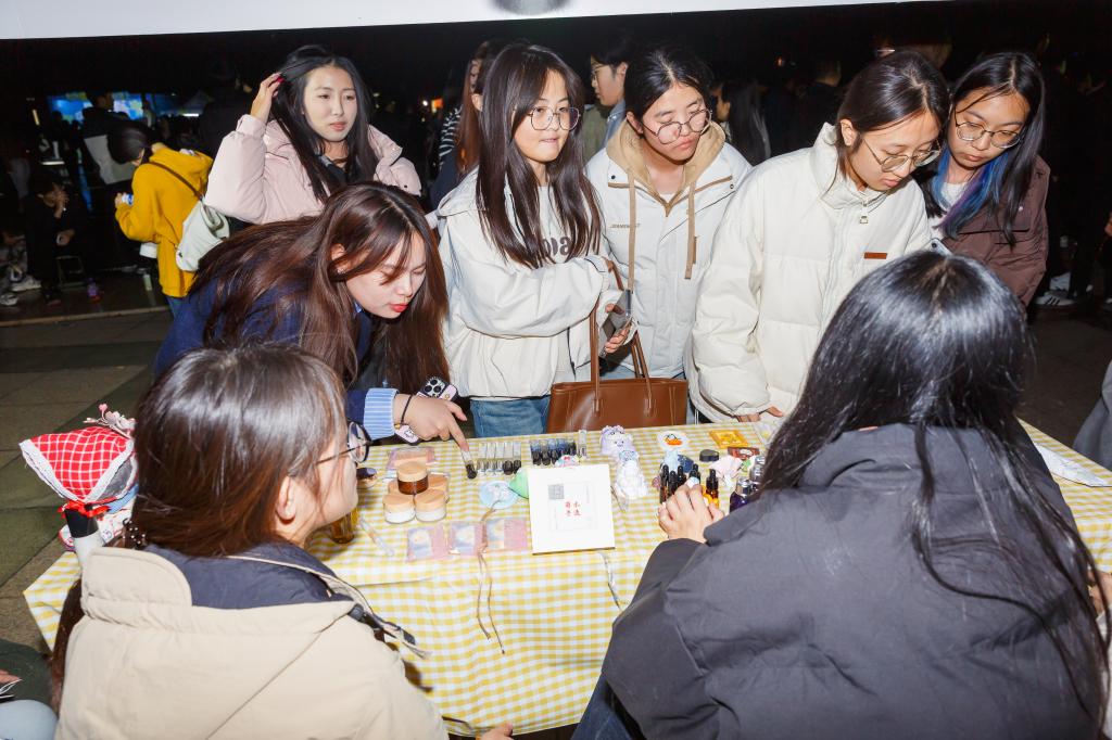 活动现场气氛热烈,青春洋溢。舞台上,两校学子轮番献艺,以激情澎湃的乐队演出、时尚动感的流行舞蹈和深情悠扬的青春歌声,尽情释放年轻活力,诠释新时代青年的个性与态度。舞台之下,“青春集市”同样百花齐放、引人驻足。尤其是学院精心设置的展示学生结合专业特色创作的四个文创产品展位成为现场焦点——跨境电商手工饰品精美别致,中药养生香包清香怡人,非遗扎染工艺独具韵味,手工皂与淬炼精油产品吸引大量观众体验互动,展现出学生创新实践与专业融合的丰硕成果。