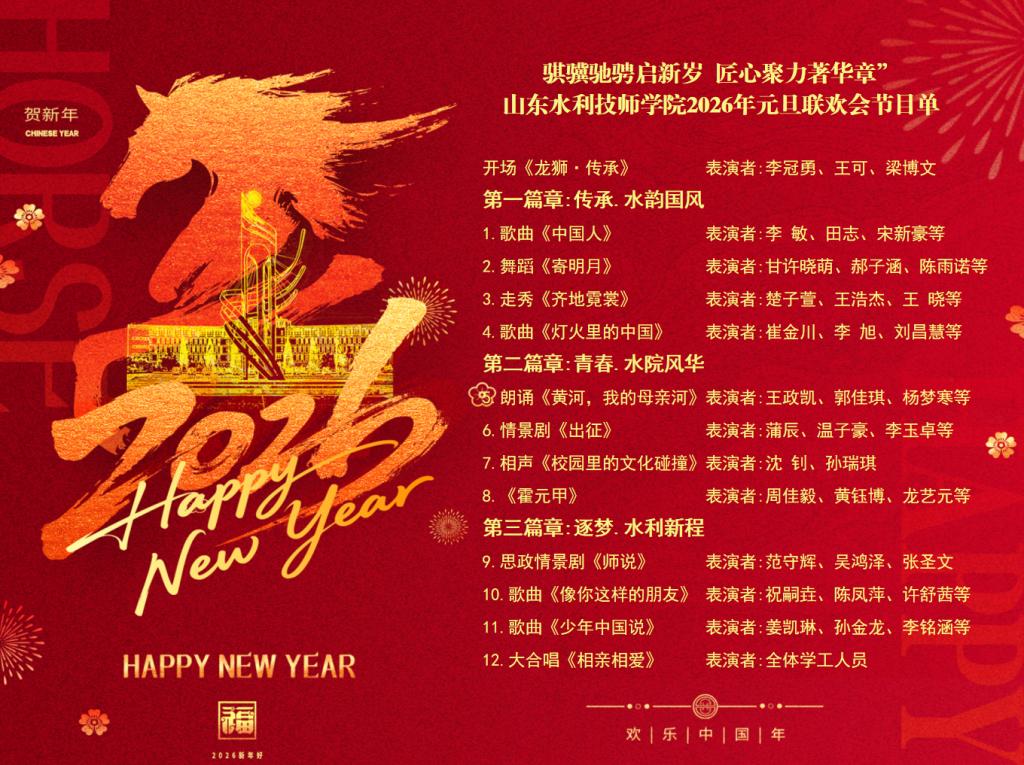 本次联欢会由“传承·水韵国风”“青春·水院风华”“逐梦·水利新程”三个篇章构成,通过12个精心编排、形式多样的节目,全面展现了学院师生在2025年弘扬传统文化、彰显青春活力、践行水利使命方面的深厚积淀与时代风采。