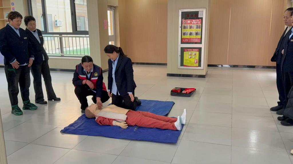 本次培训由经验丰富的宿管员王芳担任主讲,首先围绕消防安全“四懂、四会、四个能力”,结合校园公寓火灾特点剖析火灾危害,细致讲解初期火灾扑救技巧、人员有序撤离要点,明确要求宿管遇火情第一时间规范报警,熟练掌握灭火器“提、拔、握、压”操作法,落实日常隐患排查责任,主动面向学生开展消防宣传。随后的急救教学环节,主讲人演示讲解了心肺复苏、AED使用及海姆立克急救法的操作流程与关键要点,逐一纠正实操中的不规范问题,确保每位参训人员都能熟练掌握应急技能。