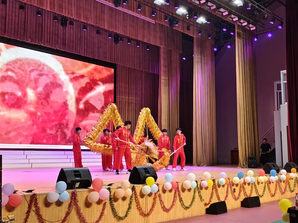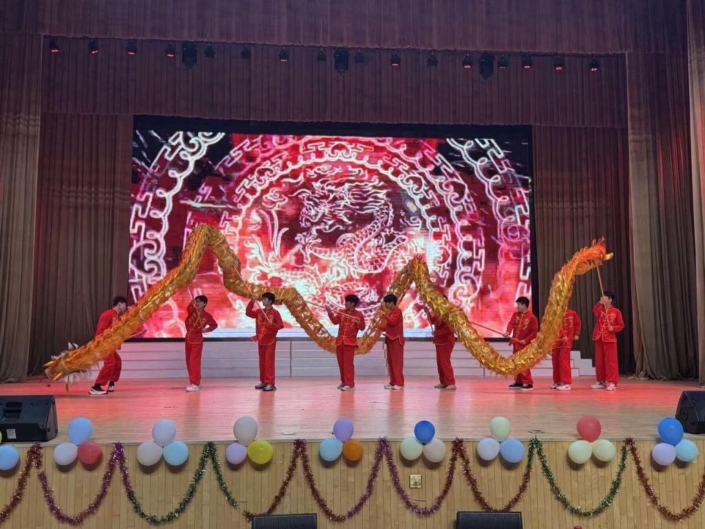 晚会开场以热闹的《舞龙舞狮》点燃气氛,近20个精心编排的节目轮番上演。歌曲《如愿》传递家国深情,《兰亭序》创新性融合传统书法与舞蹈,尽显文化韵味;《匕首操、倒功展示》气势十足,将现场氛围推向高潮。此外,《小城夏天》《永不失联的爱》等歌曲以及《舞蹈串烧》《我的未来式》《摩托摇》等舞蹈活力满满,《机械武术》更展现出学子风采。互动环节中,《猜字谜》小游戏与抽奖活动接连掀起热潮。全场师生挥舞荧光棒,沉浸在欢乐氛围里
