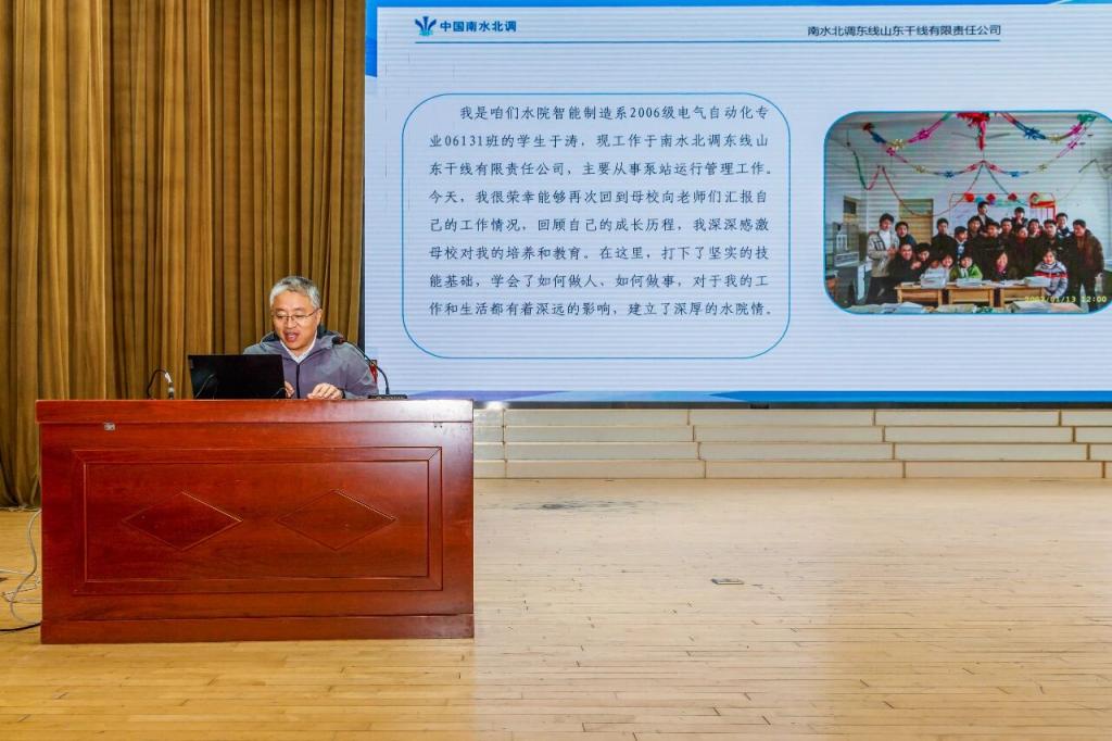 于涛是学院2006级电气自动化专业学生,2009年入职南水北调,深耕泵站运行管理十余年。讲座中,他回顾在母校打下的坚实技能基础,从直面工作难题、积累技能、创新技术、赛场争辉及传承匠心等多个方面,分享从工程一线新人,成长为获得山东省富民兴鲁劳动奖章、全国水利技能大奖等荣誉的行家里手的奋斗历程,为学弟学妹们指明职业发展方向,助力他们做好职业生涯规划。