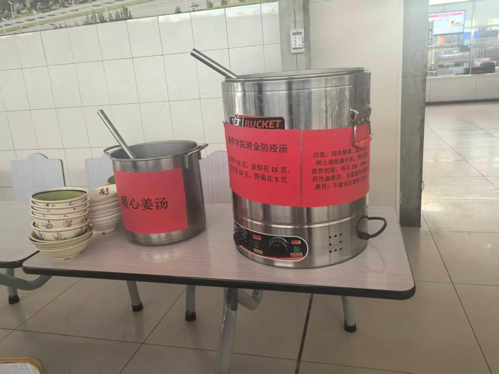 餐厅师傅们每天精选饱满老姜与醇厚红糖,经多道工序细心处理,小火慢熬出一锅锅香气浓郁的姜糖水;康养学院为提高师生免疫力,给餐厅提供了金银花等中药材,经过一个半小时的慢熬,香气四溢,令人垂涎。