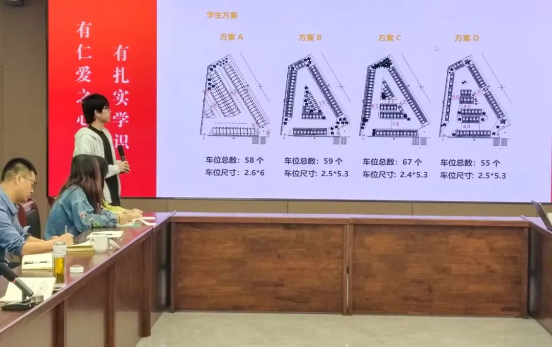 研讨会上,设计公司负责人详细介绍了停车场的多套设计方案,从场地规划、车位布局、通行效率等方面分析了各方案的可行性、合理性及优化方向,全面呈现了项目设计的整体思路与细节考量。随后,三名学生代表依次上台,辅以PPT,展示了四组由他们提供的停车场设计方案,以新颖的设计思路及良好的专业基础,赢得了与会人员的一致认可。