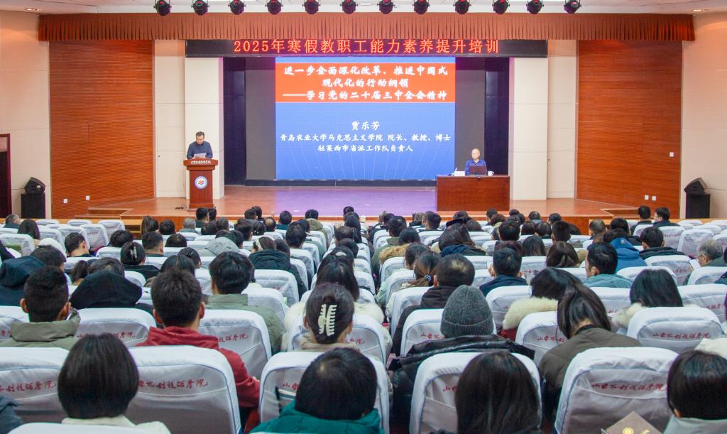 青岛农业大学马克思主义学院院长贾乐芳受邀到校,以《进一步全面深化改革、推进中国式现代化的行动纲领——学习贯彻党的二十届三中全会精神》为题,深入浅出地解读了全会精神。淄博市国家保密局和中国银行淄博分行相关负责人分别围绕保密工作和个人养老金政策进行培训。
